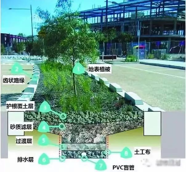 国内外比较常用的设施包括生物滞留设施、透水铺装、植草沟、渗渠、入渗池等。